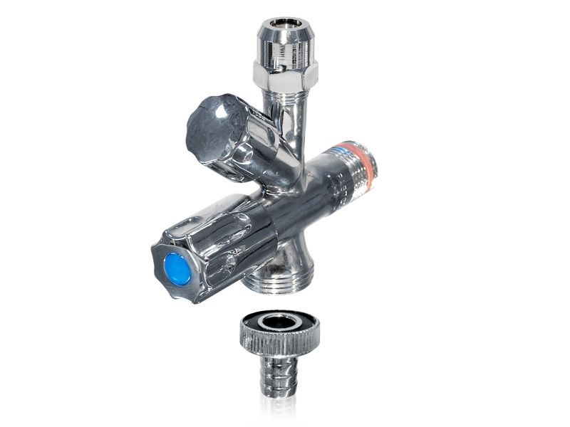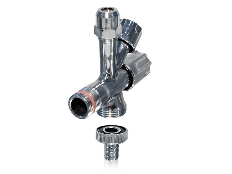 Kombi-Eckventil- 1/2" AG selbstdichtend, mit Schubrosette- 10 mm (3/8") Quetschverschraubung mit Längenausgleich- 3/4" AG mit Rückflussverhinderer für Automatenabgang- Schlauchtülle lose- Einzel-Karton-Verpackung